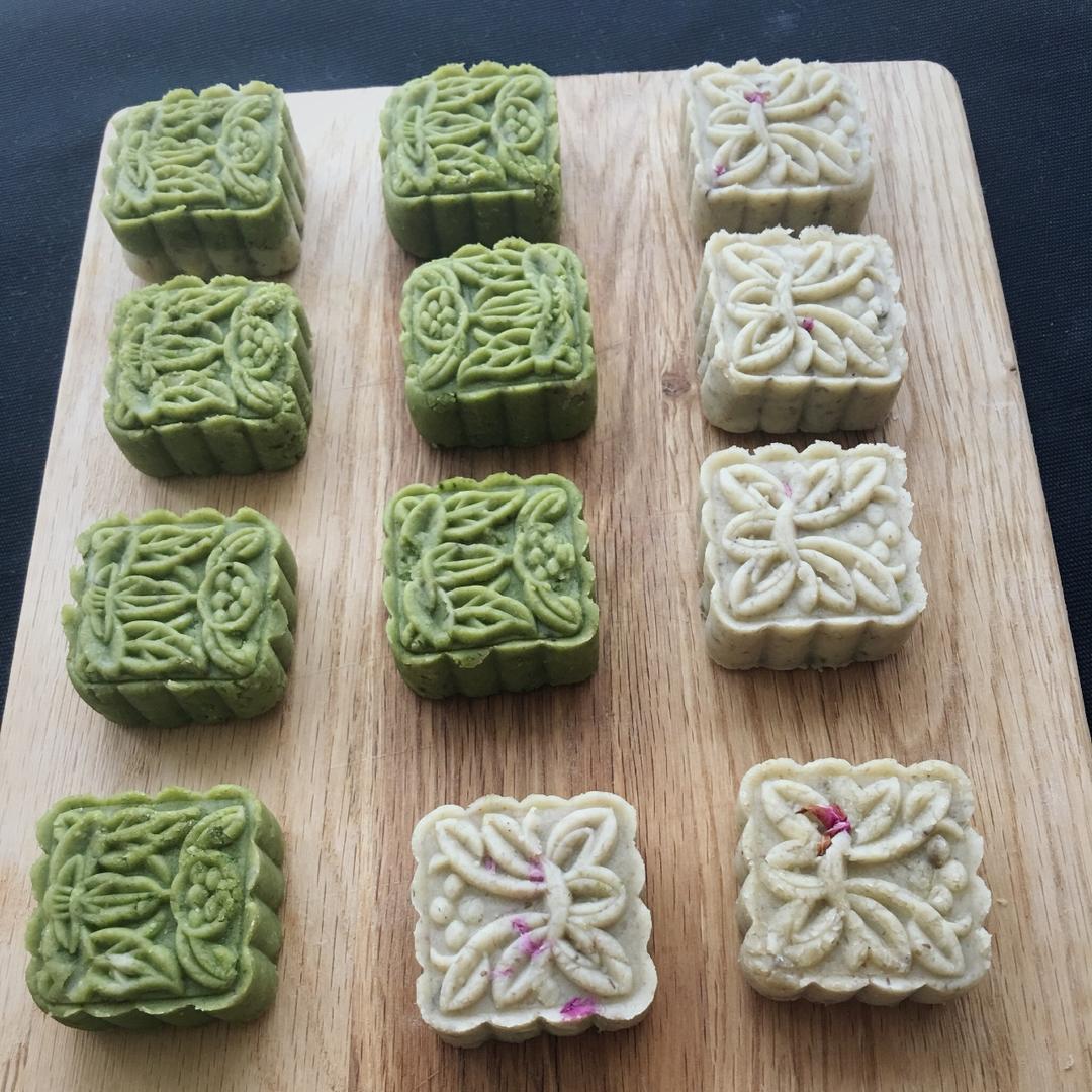 自创原味玫瑰花瓣绿豆冰糕和抹茶椰香绿豆冰糕,真是没处能买到的哈哈