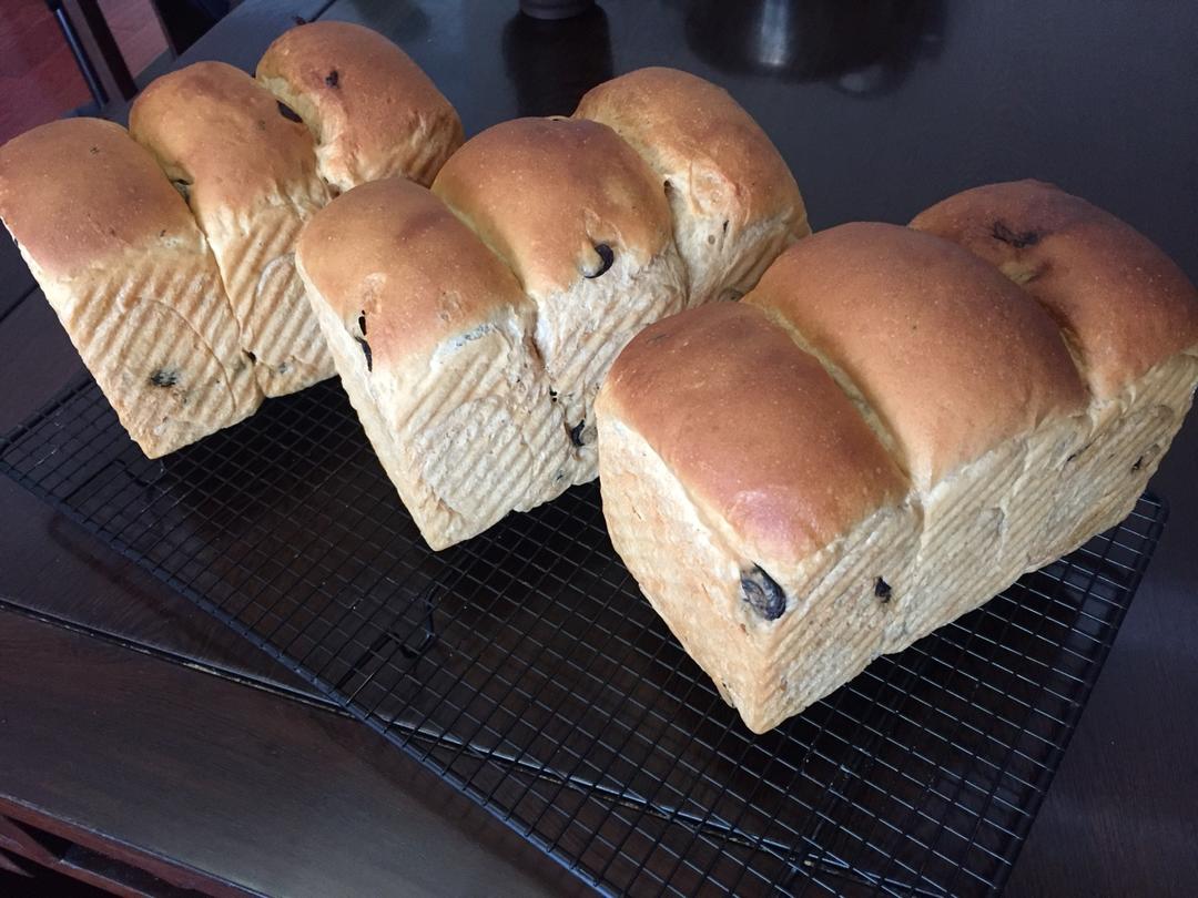 今天的题目是开光三个吐司盒,试验同时烤三个吐司。加了提子干,减了红糖,170度,15+30分钟。没及时刹住,多倒了15克牛奶。