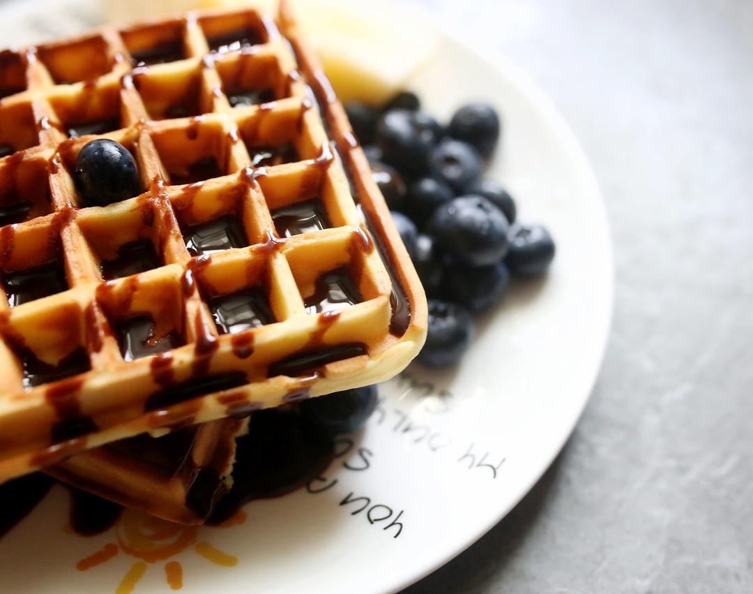 自制华夫饼搭配巧克力淋酱,再来一杯牛油果酸奶奶昔,完美。