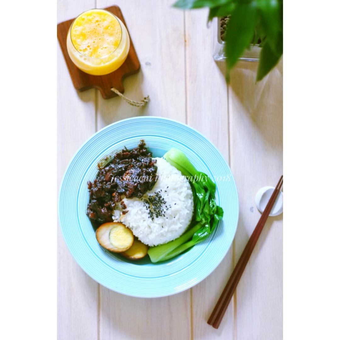 台湾卤肉饭,自己卤得汁,有肉有菜有蛋,还有碳水化合物,橙子芒果汁。