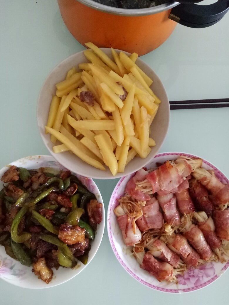 紫菜蛋汤,煮薯条,青椒炒肉,金针菇烟肉卷,小孩最爱