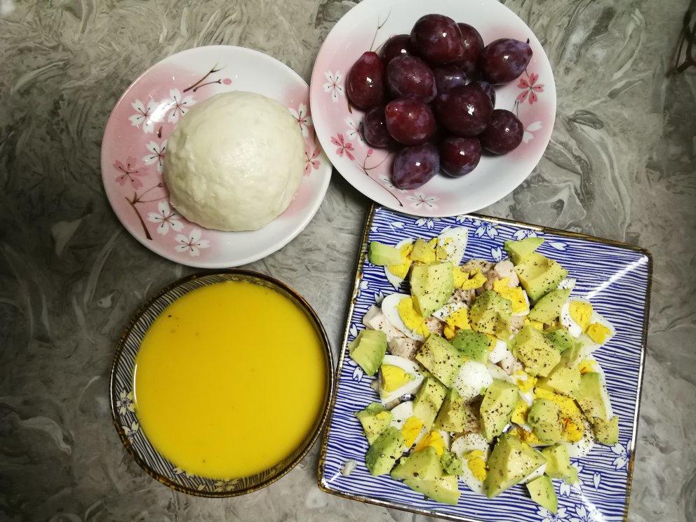 喜信 做过 早餐•2018年9月4日 #早餐•2018年9月4日#牛油果鸡蛋鸡胸肉沙拉,简单加了盐和黑胡椒,口感却很丰富,有层次感。秋天的南瓜甜蜜蜜,用它和洋葱土豆做成浓汤,就是配中式大馒头也一样耀眼灿烂。餐后水果,西梅! 2018-09-04