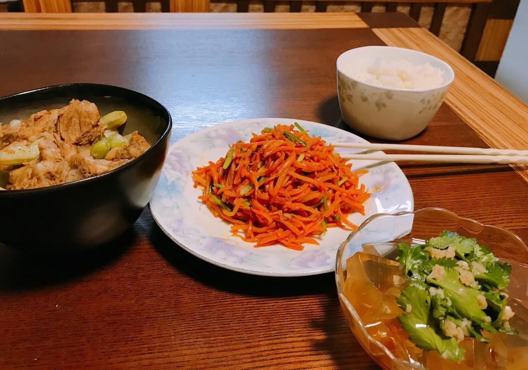 。来📲回家吃饭,蒸米饭,炒胡萝卜、排骨炖芸豆、凉粉。友友们晚餐愉快🤗