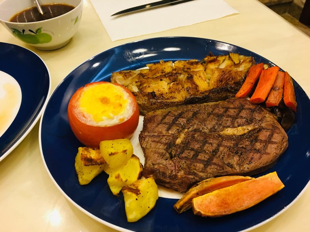 黑椒牛扒、香煎比目鱼、芝士鸡蛋焗番茄、烤土豆、烤茄子、烤胡萝卜、烤红薯