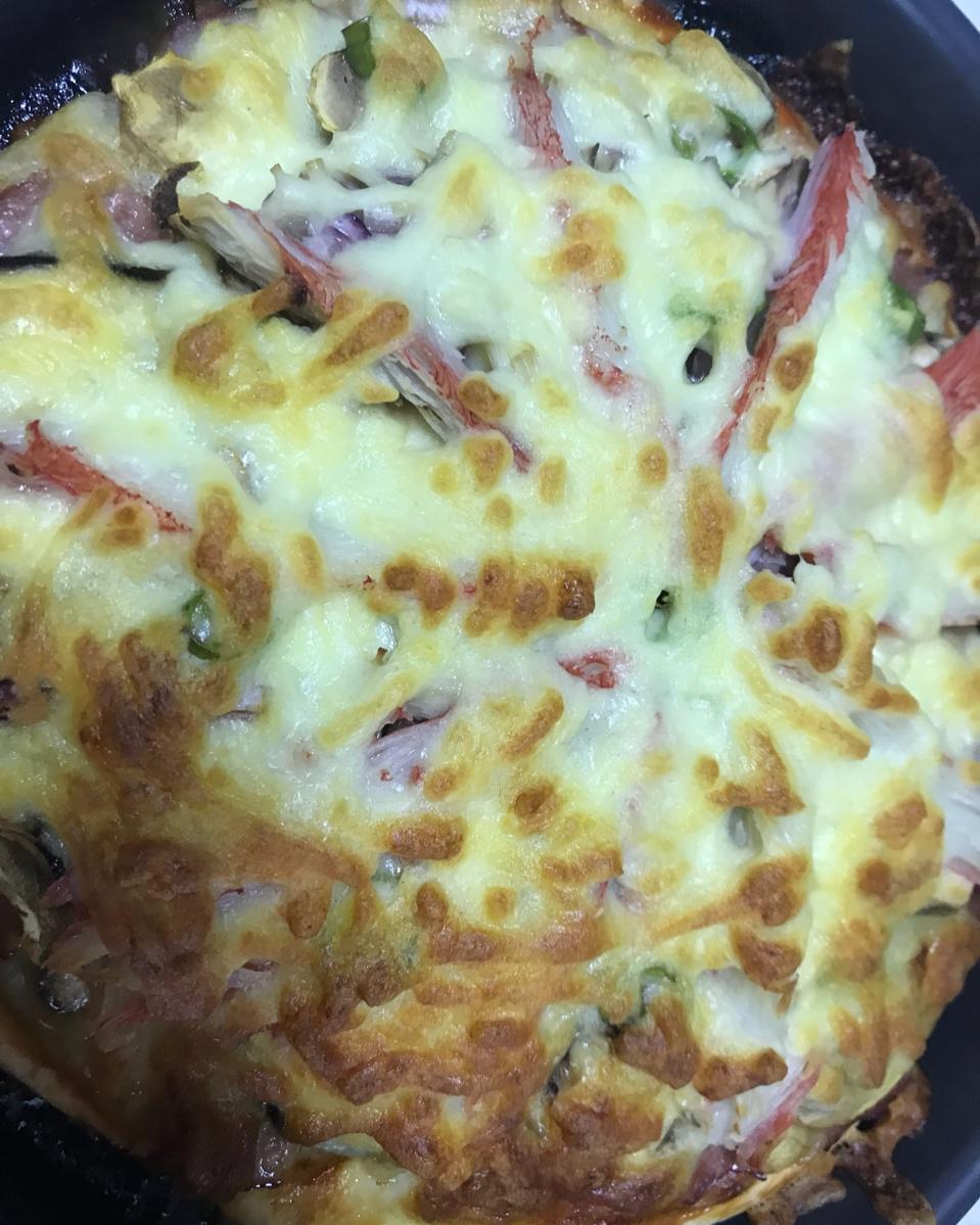 风儿吹叶儿落 做过 2018年11月17日 有了烤箱后一直想自己做披萨,没经验就买的现成饼底,将就家里有的食材培根、蘑菇、小青椒、洋葱、蟹棒、番茄酱、芝士,180°20分钟现烤当做早餐,加一杯牛奶,元气满满的一天! 2018-11-17