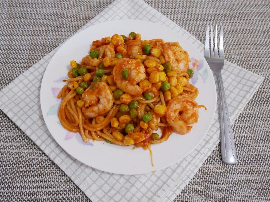 番茄虾仁意面!好久没煮意面了,好好吃~
