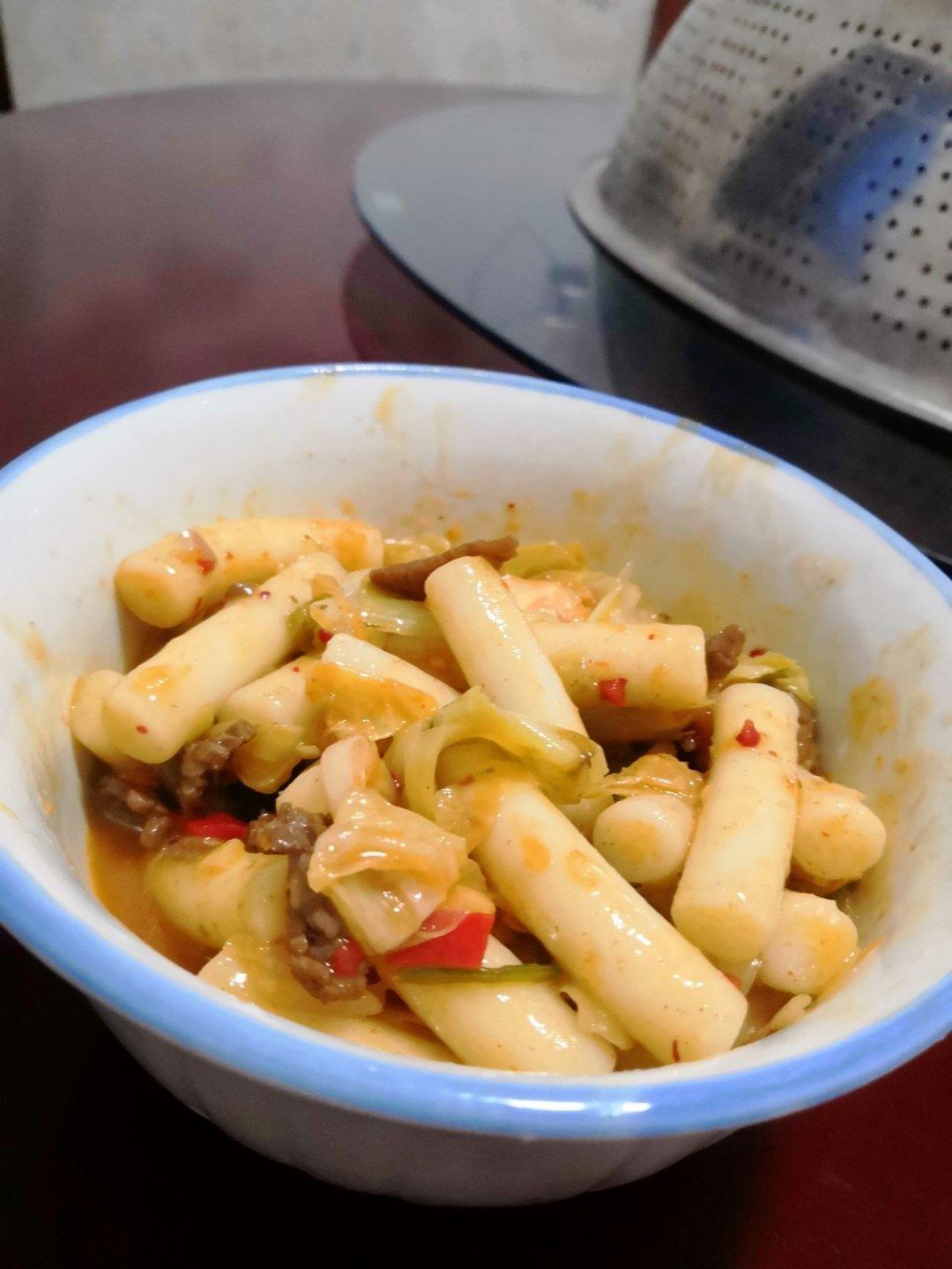 泡菜炒年糕,加了牛肉和包菜,味道还不错