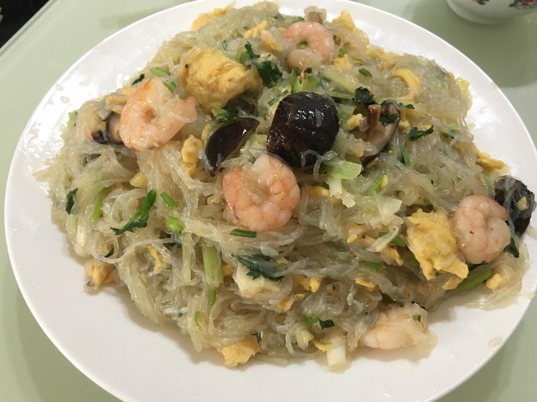 香菇粉丝虾仁鸡蛋香菜一起炒,超级好吃!