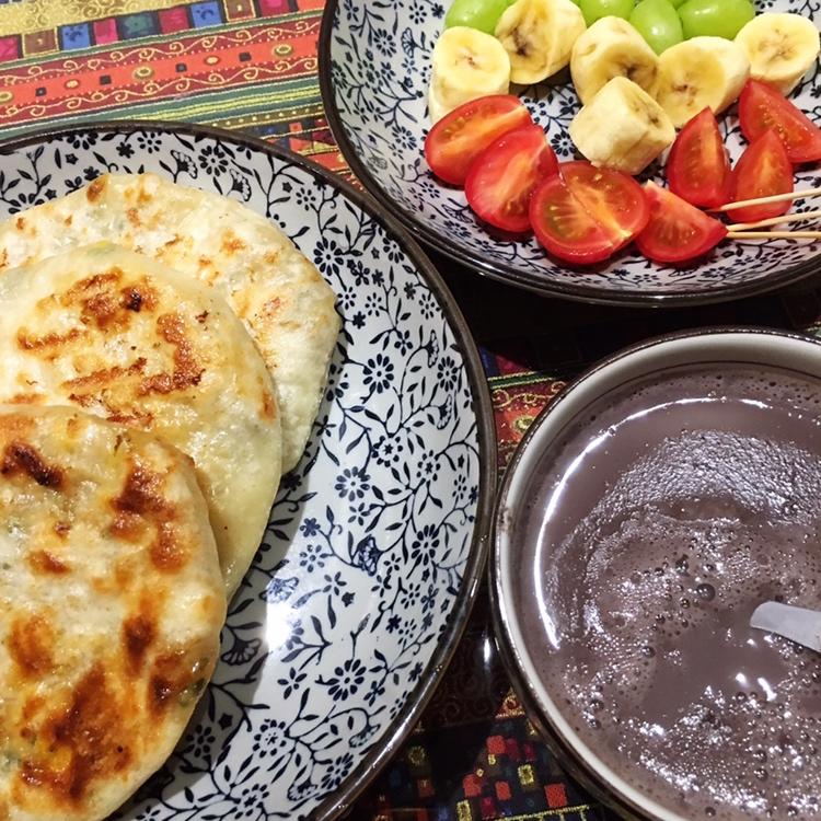 猪肉野葱馅饼+黑豆浆+水果