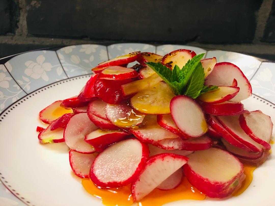 萝卜寓意好“彩头”。凉拌萝卜片的秘籍在于用糖腌制而非盐。
