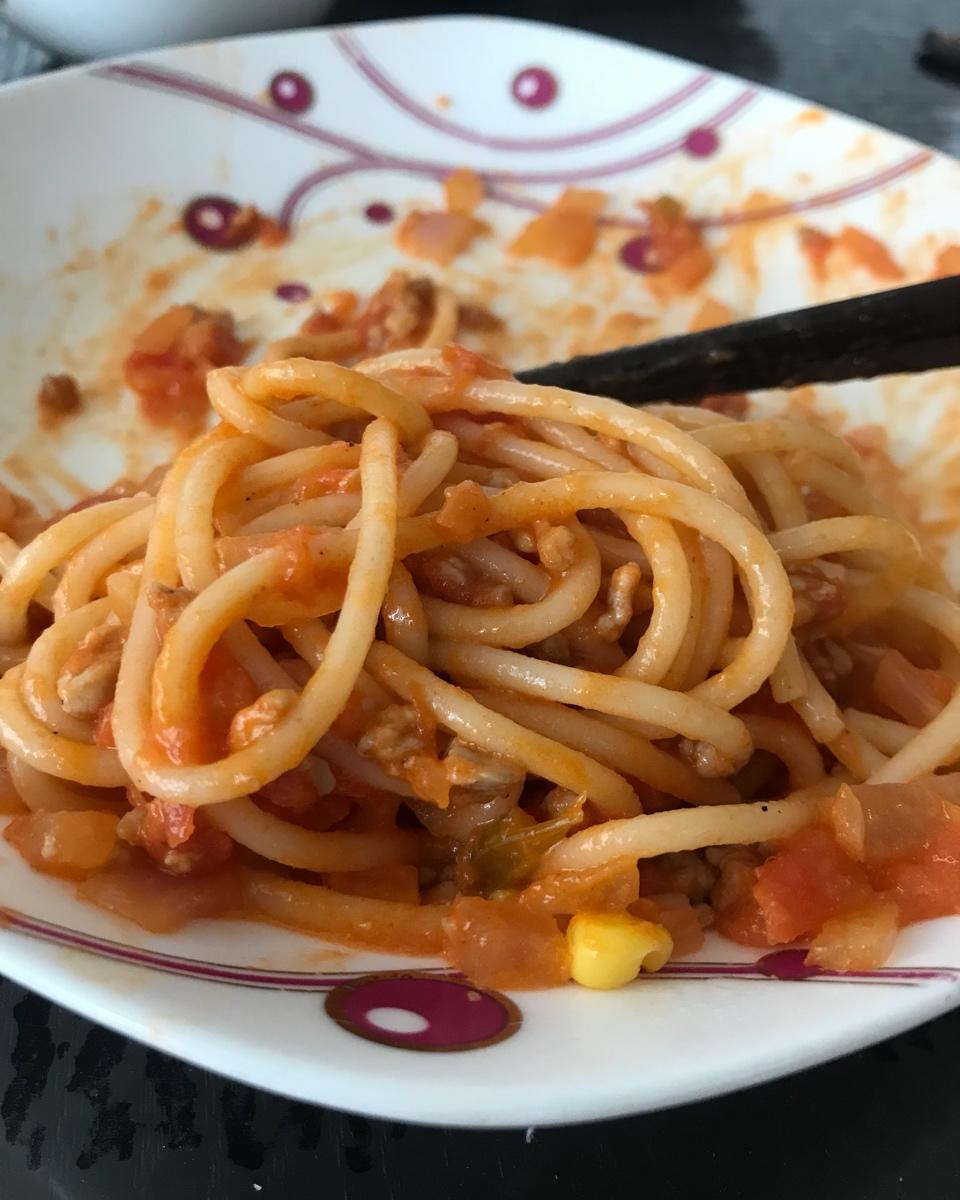 糖果的小屋 做过 (完胜必胜客的)番茄肉酱意大利面~ 快吃完了才想起来拍照,这种渣图只为了做记录,按方子来做的,买了小里脊肉切成肉沫,洋葱用了紫洋葱(因为不知道要用白洋葱),番茄自己就出水很多,所以我就没有放水了,直接加了牛奶熬制汤浓稠,最后加盐和黑胡椒粉调味~是我做过最简单又好吃的意面!#早餐•2019年5月9日# 2019-05-09