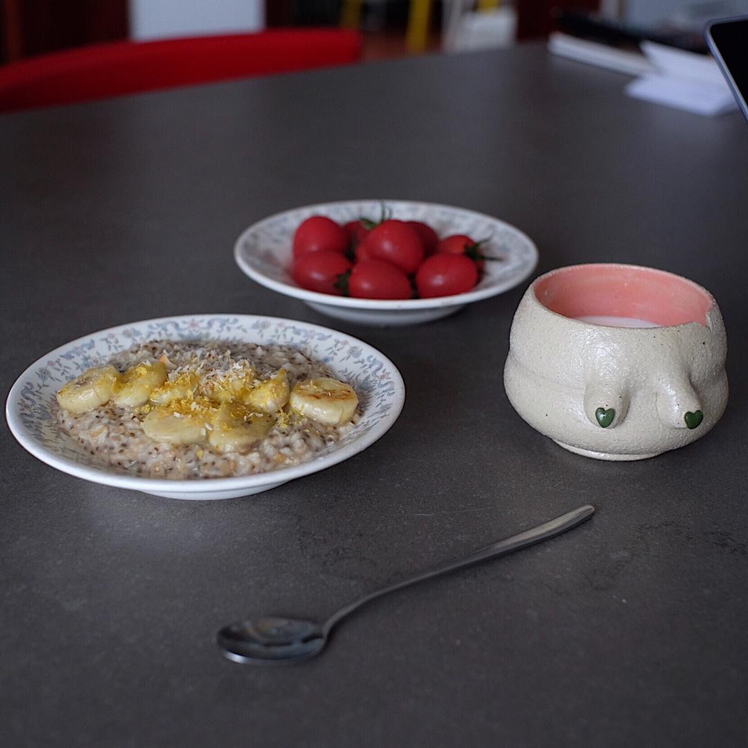Autumn-Desert 做过 午餐•2019年5月13日 习惯了在周一的中午煮一碗燕麦粥,清一清周末的油肠子。烧开水抓两把燕麦,通常是看到橱柜里有什么就加一点,比如奇亚籽/姜黄/芝麻。今天放了奇亚籽和干姜粒,还有一小勺的焦糖酱。Topping是黄油煎过的香蕉,再撒上素芝士/椰片。去年从新加坡背回来的奶杯,才用上,这么黄暴力这么喜欢😌#午餐•2019年5月13日# 2019-05-13