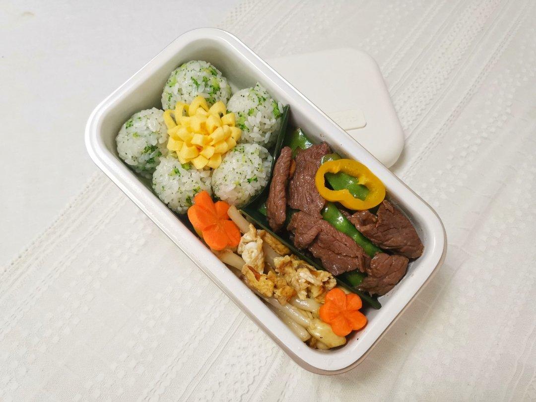 今日便当🍱 : 荷兰豆炒牛肉,鸡蛋炒花生芽,主食是西兰花饭团。。