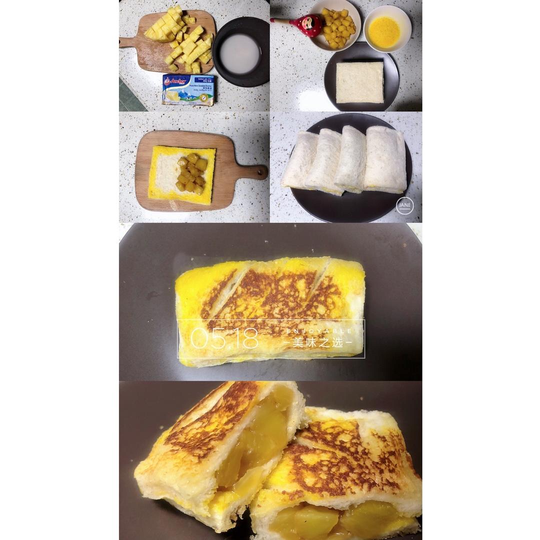 步骤二:打个鸡蛋、切片面包切掉四个硬边,把炒好的凤梨丁放面包上,四周涂上鸡蛋液,把面包卷起来粘上。