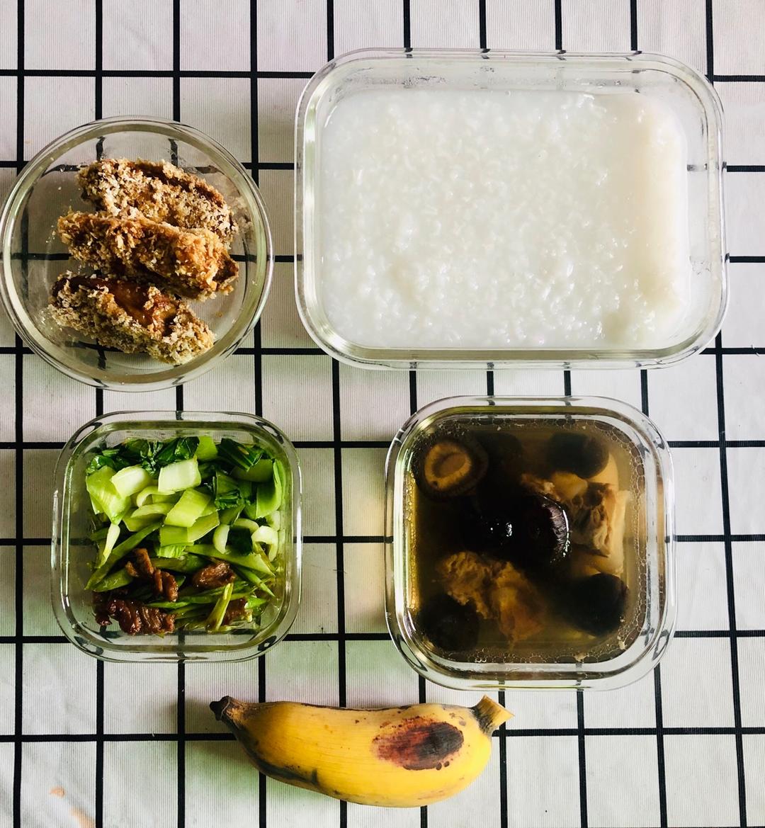 5.23:炸翅 上海青 四季豆炒肉 白粥 香菇排骨汤 蕉(特么地忘带了)……