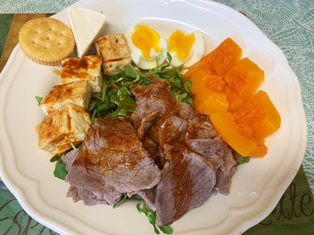 今晚是蒸南瓜、溏心蛋(没切好),奶酪和饼干4块抹着吃。