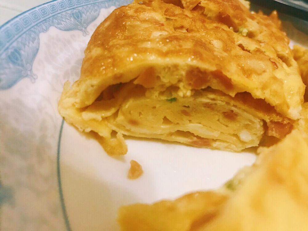 就放了两根火腿肠 还有一点葱花 把它卷成卷真不容易啊 整体做出来不太美观🥺但是切面很好看~味道也超棒!