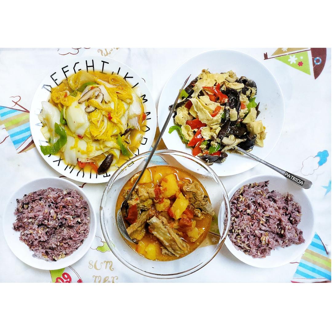 番茄土豆炖排骨,炒大白菜,什锦杂烩,粗粮米饭。