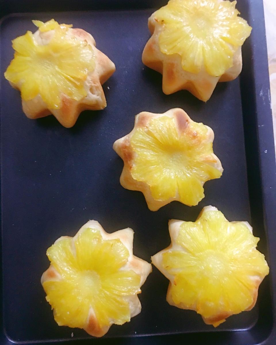 买了菠萝没买橙子,下次再用橙子,记一个自己烤箱用的温度下火190度35分钟,上火165度30分钟加5分钟180度上色