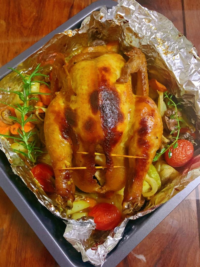 Lisa手作 做过 感恩节柠檬百里香烤鸡配蔬菜(圣诞烤鸡通用食谱) 加入了新鲜的迷迭香和柠檬百里香,有一种独特的香气,配菜用了土豆、胡萝卜🥕、口蘑、甜豆和小番茄#晚餐•2019年12月25日#养了多日的香草今天派上了用场 2019-12-25
