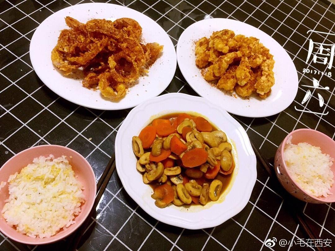 炸洋葱圈,炸龙利鱼,胡萝卜炒口蘑