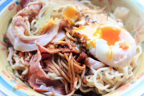 好吃到流泪!冰箱里还有培根和泡菜,就随手丢进去了。用方便面煮的,加了麻酱、酱油、辣椒油,溏心鸡蛋秒杀一切!太好吃了!!!