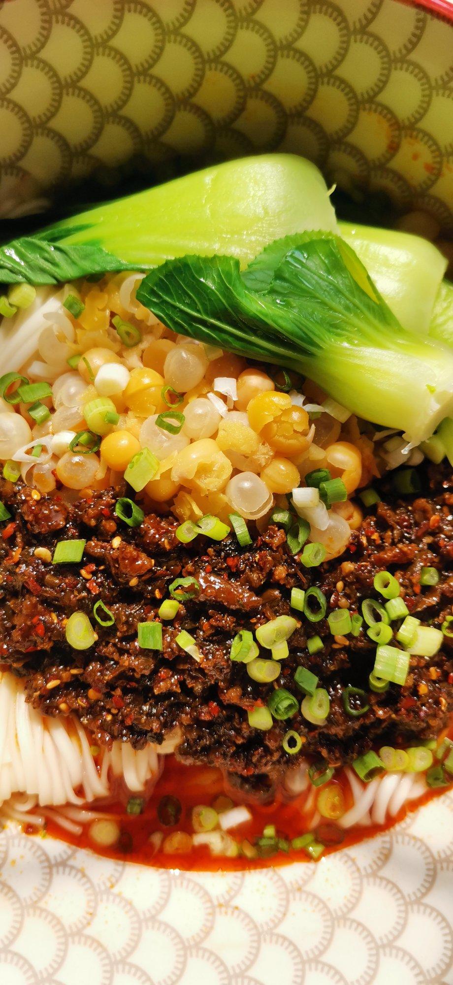 豌豆是老公的种子被煮了😂,提前炒好的肉酱拌上刚烫的辣椒油,铺上几片非常新鲜的上海青,洒上小细葱花,😍真是超级超级好吃到爆!