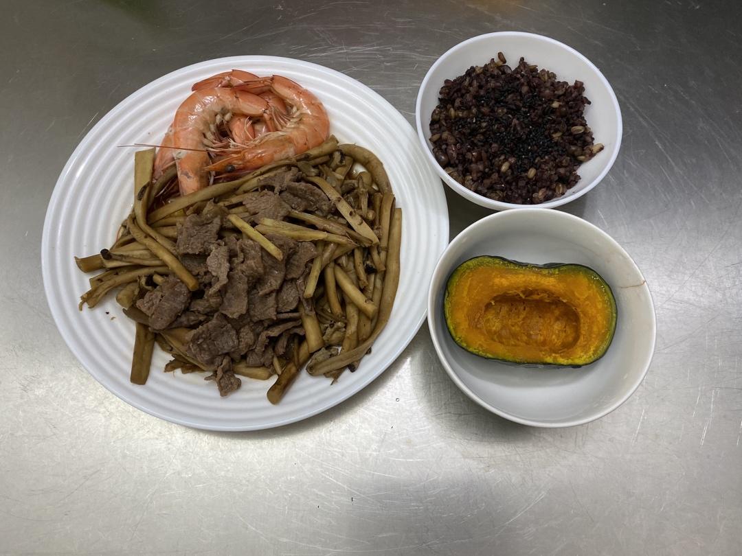白灼虾,炒牛肉,炒茶树菇,蒸南瓜,杂豆米饭。