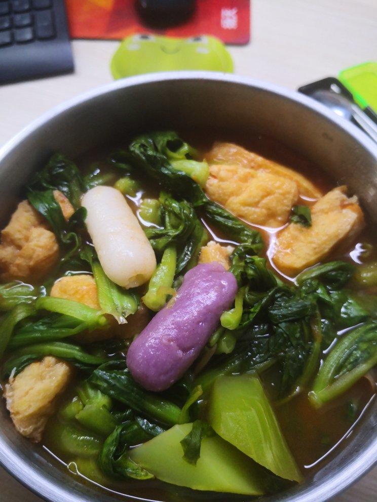 芝芝年糕,番茄菌菇汤底,配菜:莴笋+油豆腐+青菜