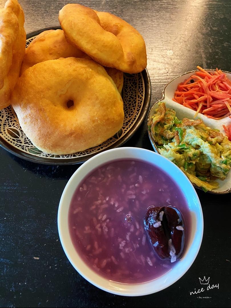 紫薯粥,油饼配上小菜