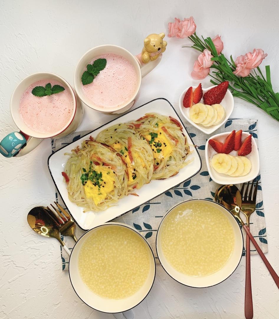 俩宝儿的麻麻_ 做过 早餐•2020年4月14日 美好的一天从早餐开始☀️🌹土豆+火腿片+鸡蛋+葱花+芝麻,一锅煎四个😂,好吃的土豆火腿鸡蛋饼就做好了✌️。搭配一碗养胃的小米粥,还有一杯孩子们最爱的草莓奶昔🍓,营养的早餐,孩子们都全部光盘😜#早餐•2020年4月14日# #早餐早餐# 2020-04-14
