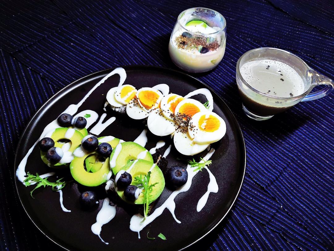 牛油果鸡蛋 黑吐司片配黑芝麻豆浆