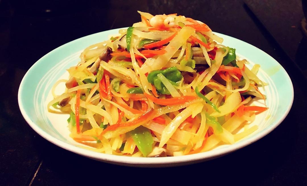 炒土豆丝(配菜:胡萝卜,虎皮椒,香菇)这道菜的亮点在油:鸡油。图二:上次烧老母鸡汤,留的半碗鸡油。