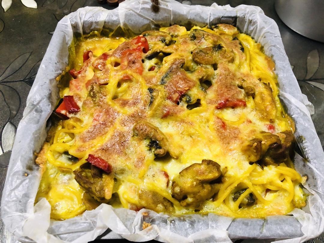 Vronskava 做过 2020年04月15日 全家人分量意面🍝 一把 煮软鸡腿 三个 去骨炒熟红椒🌶️ 两条 增色用蘑菇🍄 半斤 切片炒香咖喱块 三块 牛奶🥛 适量🌽玉米淀粉 适量 勾芡用一锅端 铺芝士🧀 烤箱上层 上下火200°C 15min 2020-04-15