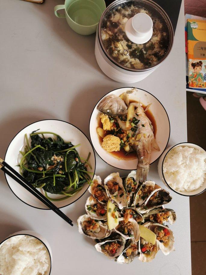 清蒸鲈鱼+蒸生蚝+炒番薯叶+紫菜蛋花汤