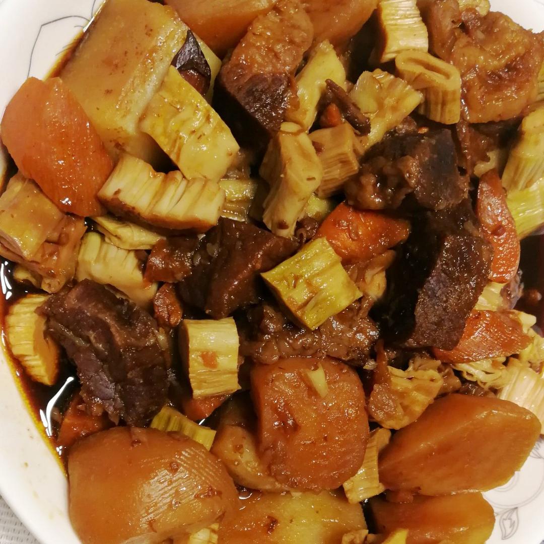 红烧牛肉炖土豆胡萝卜和笋(牛肉冷水加姜片和料酒,焯水。锅里倒油,放入八角2个和姜片、冰糖炒香后,放入牛肉翻炒,然后,放入料酒,生抽、老抽翻炒上色,然后放入去皮西红柿翻炒。没有西红柿的话,番茄沙司也行。炒一会儿,放入开水,开水要沒过牛肉。大火烧开后,转中小火炖50分钟。我是用砂锅炖的,喜欢烂一点的话,用高压锅省时间。肉烂后,放土豆,胡萝卜,竹笋等,再炖20分钟左右,肉烂菜软即可出锅啦。)