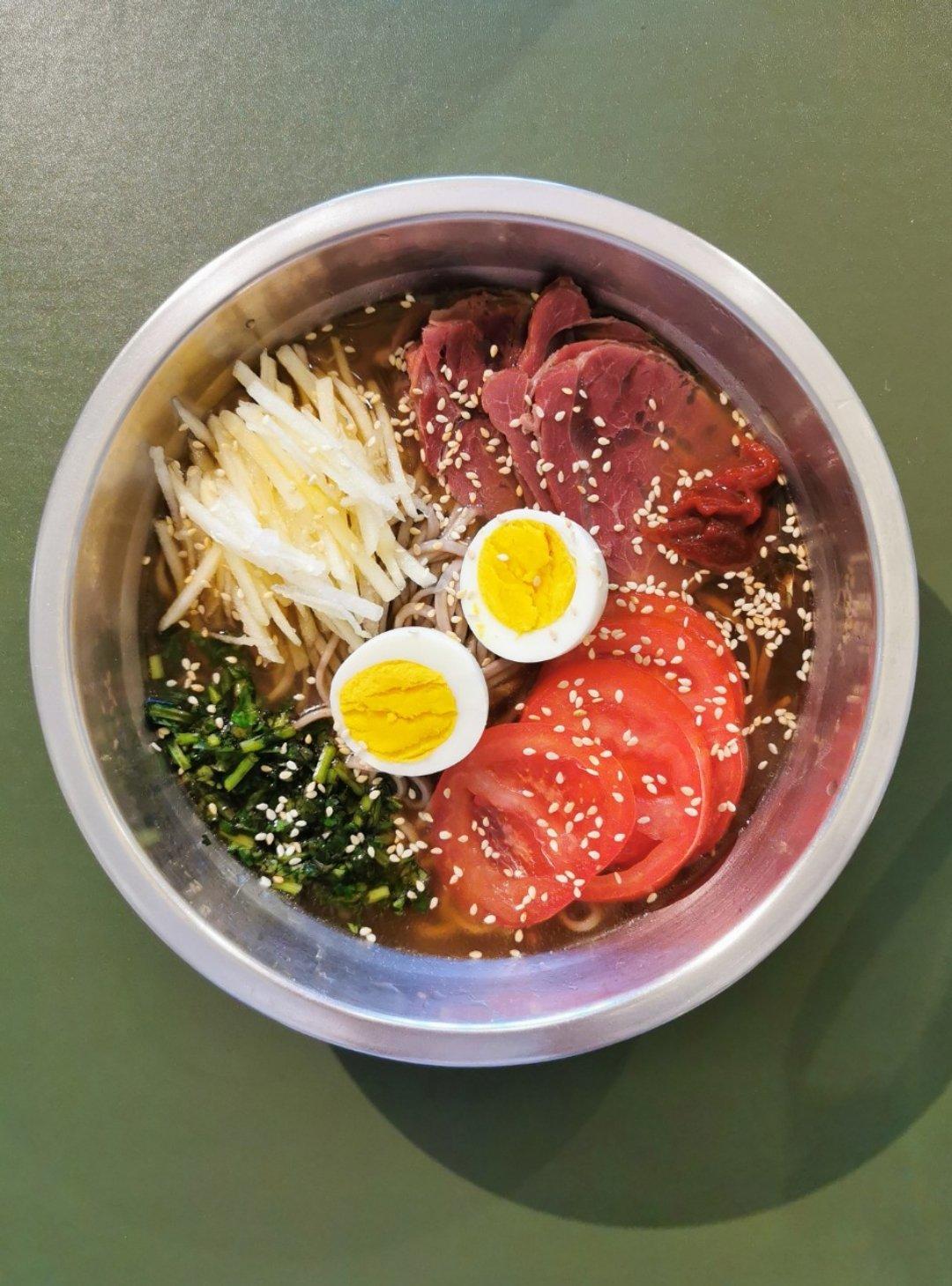 Yunki7 做过 韩国冷面 材料不够,做了调整。1.没有冷面,用的荞麦挂面。2.黄瓜没有,换了香菜末。3.调汤汁,没有白醋/苹果醋,用的镇江香醋;没有雪碧,用的可乐囧。虽然后面加了勺韩国酱料,但是感觉还是淡了,下次做记得调整下。4.最后加了芝麻。5.没有生牛肉,用的酱牛肉。 2020-04-17