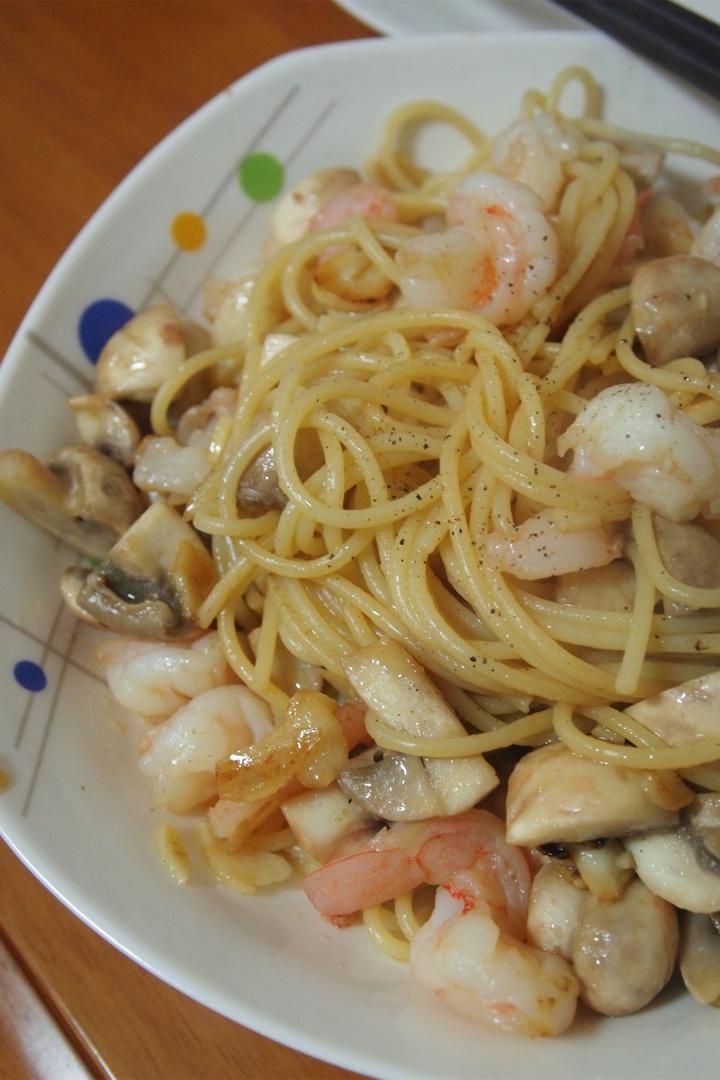 扎西索南吉 做过 晚餐•2020年4月19日 #晚餐•2020年4月19日#蒜片、口蘑、虾、黑胡椒炒意面,本来要放白葡萄酒的,依旧是考虑到不愿意吃一点酒的姑奶奶,改为放了一丢丢生抽。总之清淡好吃。 2020-04-19