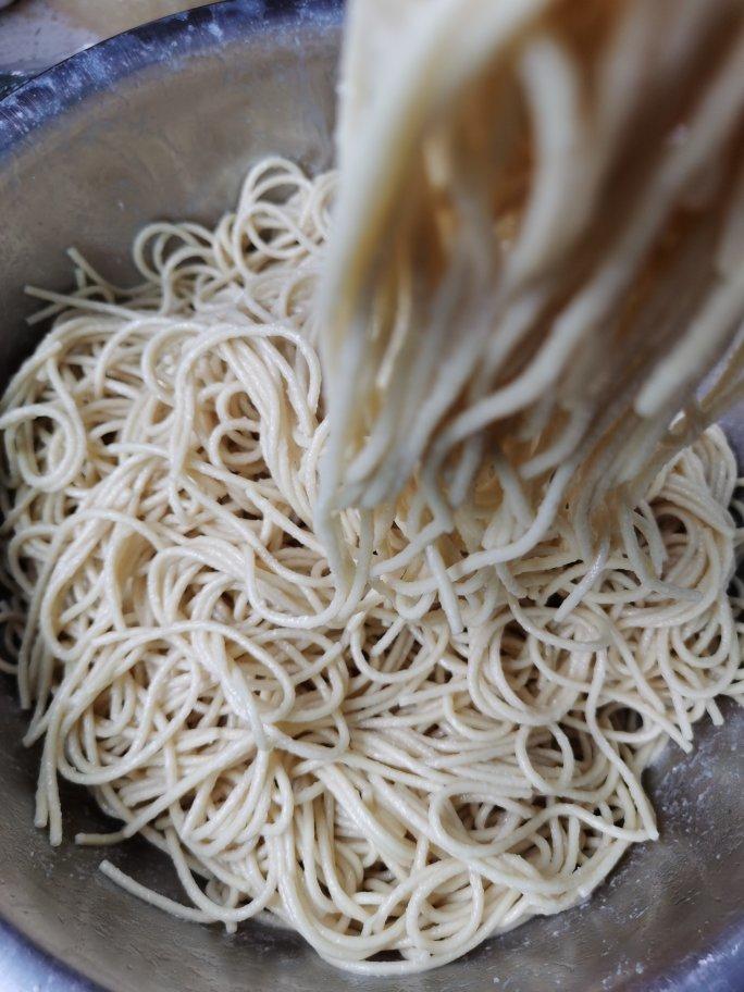 二:捞起来放盆子里,加入50毫升的芝麻香油(这样面就不会黏在一起),等它们凉了之后打包袋子里备用。