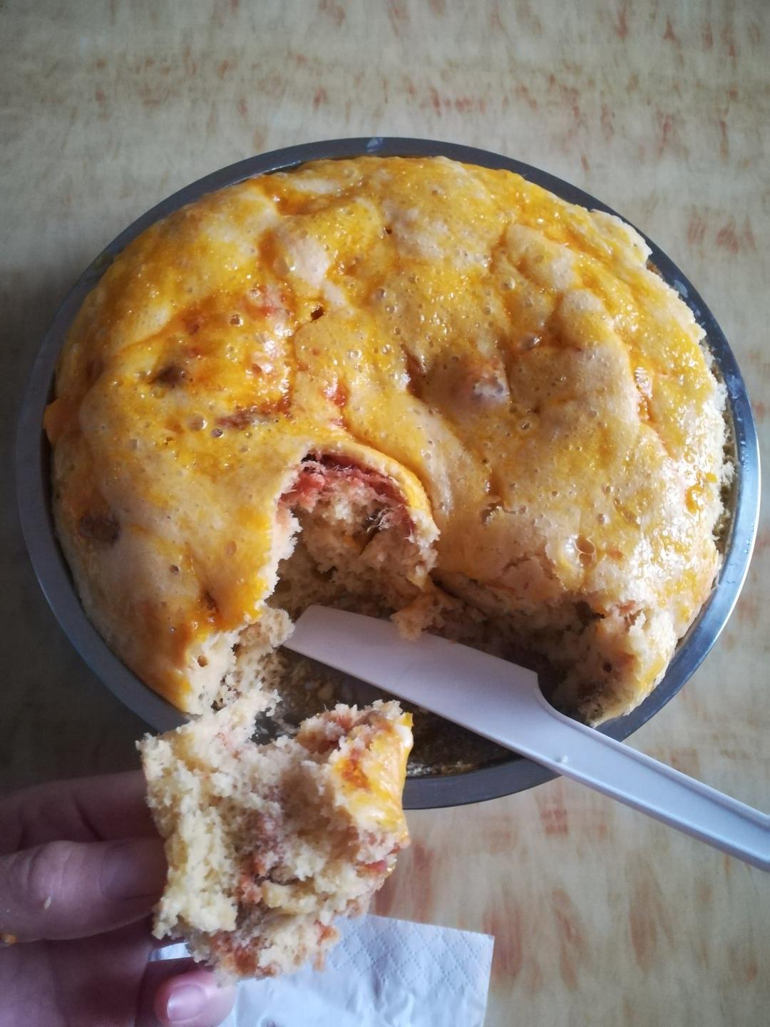 做的蒸面包,加了肉松和葡萄干,面上可放些蔓越莓,味道挺不错,家人都爱吃,一星期至少做一次!