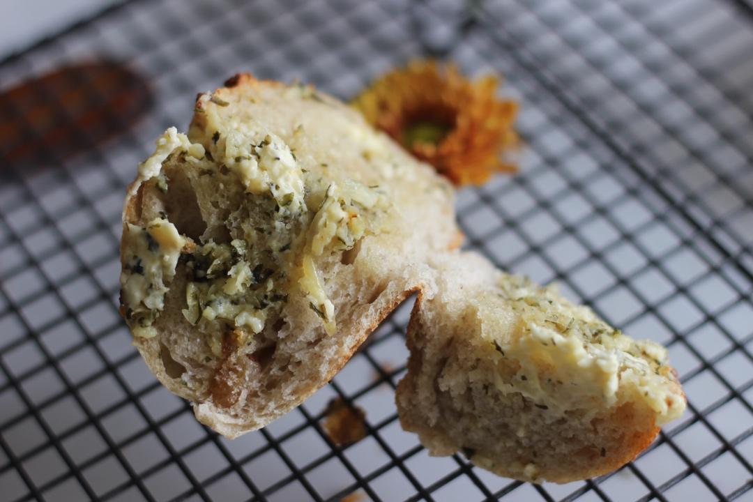 欧包的缺点就是凉了 没那么好吃 但配上这个蒜泥狠就好多了 毕竟相当于有风味的复烤