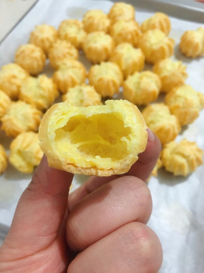 昨天晚上做的泡芙,虽然都烤开花了,但每个都是空心的,挤上奶油之后很好吃