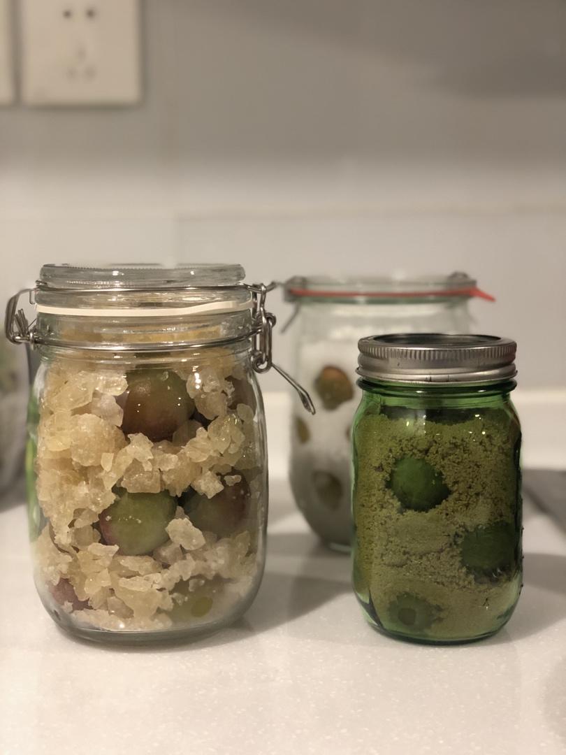 徐小槑大小姐 做过 梅子酒🍶&梅子露&梅子醋&梅子苏打🍸 #晚餐•2020年4月21日# 又来打卡了,冷冻两天的梅纸稍微擦拭下外头的冰渣分别用等量的冰糖和赤砂糖,打算室温一天然后放入冰箱冷藏,后头的绵白糖已经开始化糖浆啦 2020-04-21