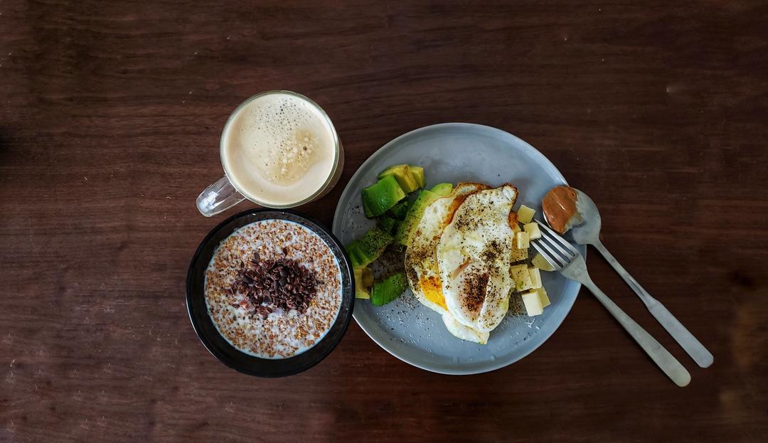 avocado, fried egg, cereal, cacao, latte