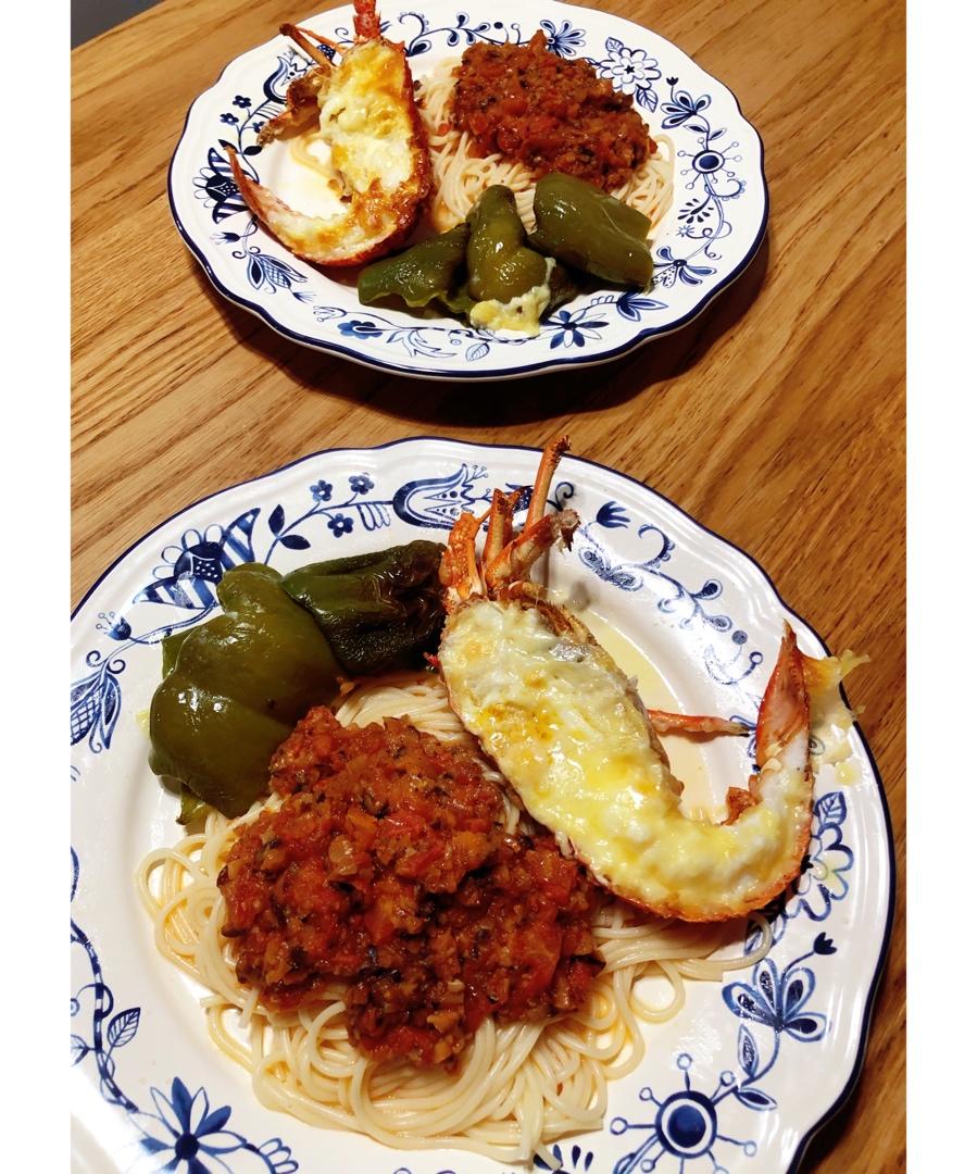小龙虾🦞只要55块,一起烤了个柿子椒,有点太久了,意大利面属于我家日常~