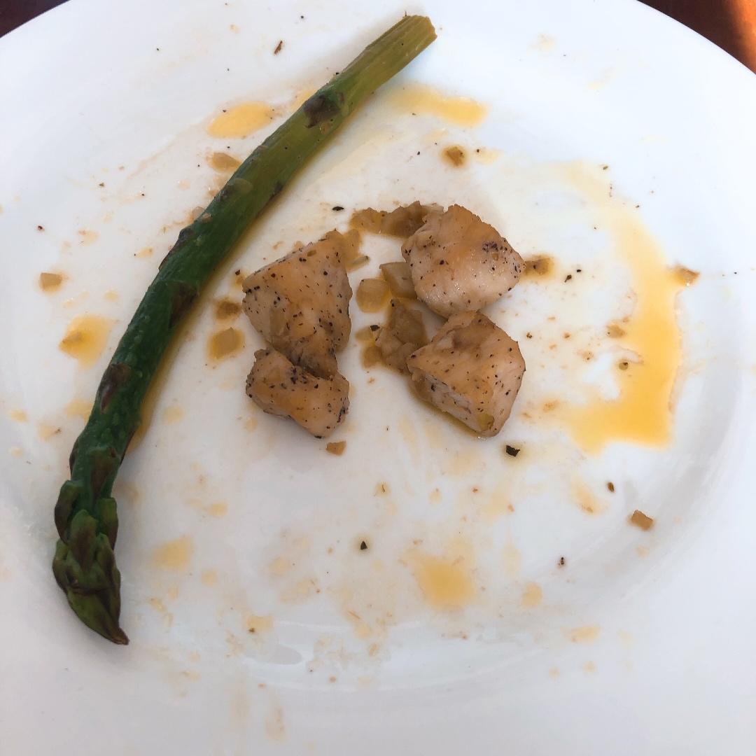 吃剩下的四块鸡胸和一根芦笋...也太香了叭黄油🧈,人间美味。煮烂的蒜也巨好吃!就是蒜粒咸了点.....