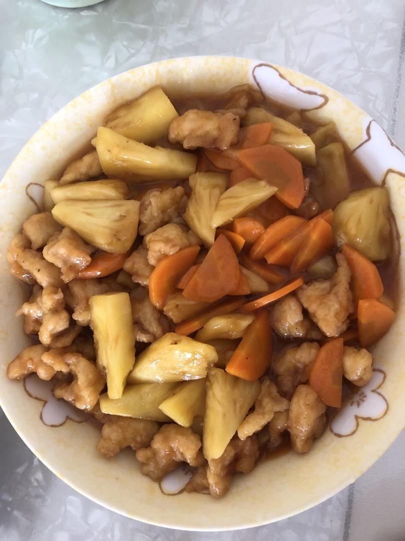 蜜萌桃桃 做过 咕噜肉(菠萝+鸡胸肉) 只放了胡萝卜 鸡胸肉 菠萝 没放其他配菜 放完调料之后太粘稠了 又把所有配菜放进去 一看 完了 这么粘稠怎么吃 后来又兑了水 煮了两分钟 汤也不粘稠了 鸡胸肉正好也煮软了 不喜欢吃硬的 没想到最后成品还挺满意 #午餐•2020年4月28日# 2020-04-28
