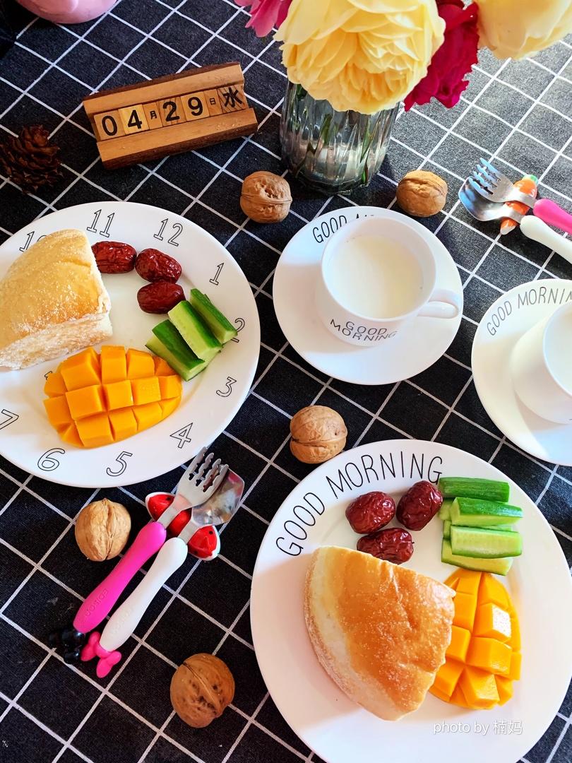 今日早餐——奶酪包、牛奶🥛、坚果和果蔬。