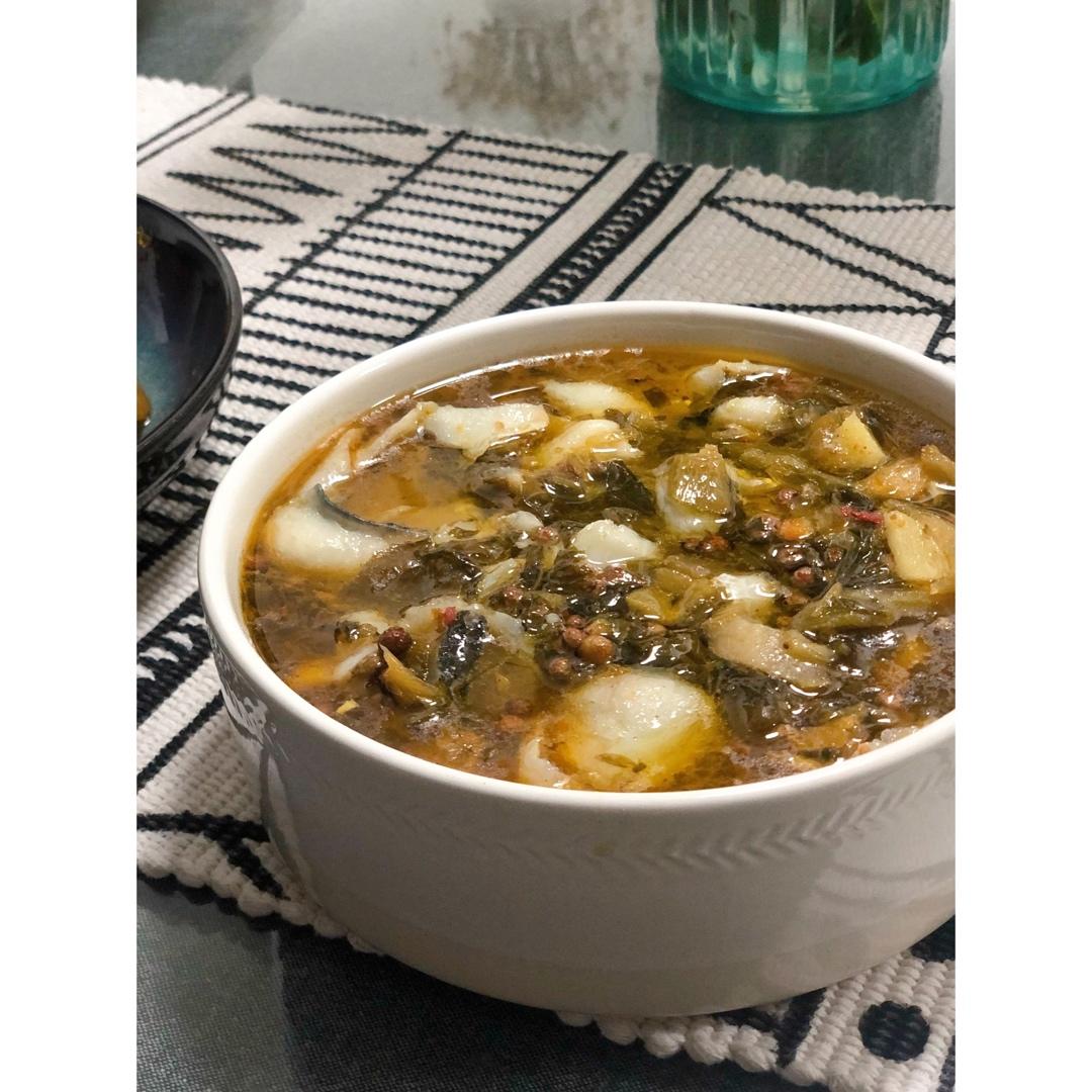 Gnoiq_X 做过 酸菜鱼 买的冷冻鱼片所以没有鱼头鱼骨可以熬汤…正好家里还有前阵子冷冻成冰块的鸡汤,凑合用上。加了勺黄灯笼辣椒酱,淋了点藤椒油~好香#晚餐•2020年4月30日# 2020-04-30