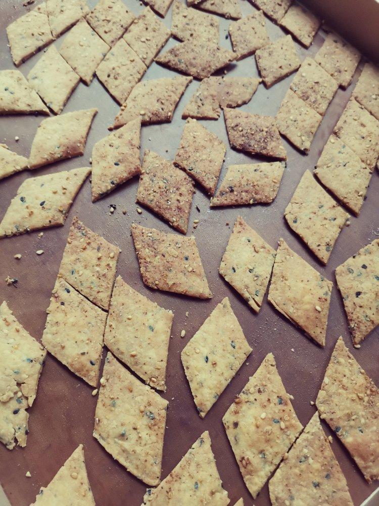 琢磨着怎样吃。玉米面60g、普粉60g、黑芝麻10g、芝麻碎8g、盐2g花生油20g、牛奶随手倒了点大概60g左右和成面团,放在油纸上擀成一元硬币厚度,提油纸移入烤盘、面片上刷油(我用刮板刮油)撒喜欢的调味料(南德方便面料芝麻碎混合),刮板切菱形块,入烤箱上火185下火140